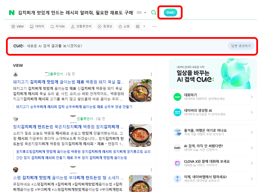 우선 제일 먼저 쉽게 확인할 수 있는 부분은 바로 네이버에서 늘 밀어주는 블로그 인플루언서 분들의 블로그가 최상단에 나오는 모습을 보여주고 있습니다. 여기까지는 기존과 같지만, CUE:가 새롭게 생겨난 모습을 보실 수 있습니다. 그렇다면, 우측에 있는 답변 생성하기를 누르면 과연 어떤 결과가 될지 눌러보도록 하겠습니다.