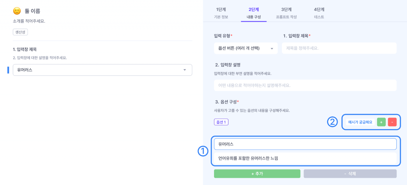 두 번째, 내용 구성입니다. 사용자들이 보게 될 툴의 UI를 구성하는 곳으로 입력유형과 입력창에 들어갈 알맞은 제목은 물론 필요에 따라 툴에 대한 간략한 소개도 가능합니다. 한 줄 입력의 경우에는 짧은 문장이나 키워드를 입력하기 좋으며, 그 외 입력유형은 긴 문장을 입력받기 좋습니다. 뿐만 아니라, 나중에 이 툴을 사용할 다른 사용자를 위한 설명과 어떻게 입력하는 것이 가장 정확하게 타게팅이 되는지 입력예시를 보여줄 수 있도록 세팅되어 있습니다. 뿐만 아니라, 드롭다운과 옵션 버튼을 통해서 조금 더 세밀하게 툴을 조정할 수 있습니다.