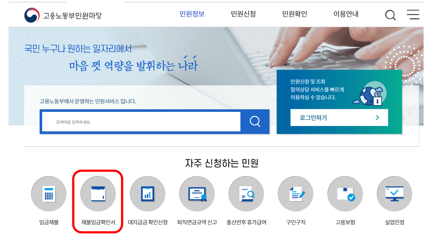우선 연차수당 미지급 신고에 대한 민원 신청을 위한 필수 제출 서류인 임금체불 신청서를 다운로드하기 위해서, 고용노동부 민원마당에 들어가면 자주 신청하는 민원란에 체불임금확인서가 있습니다.