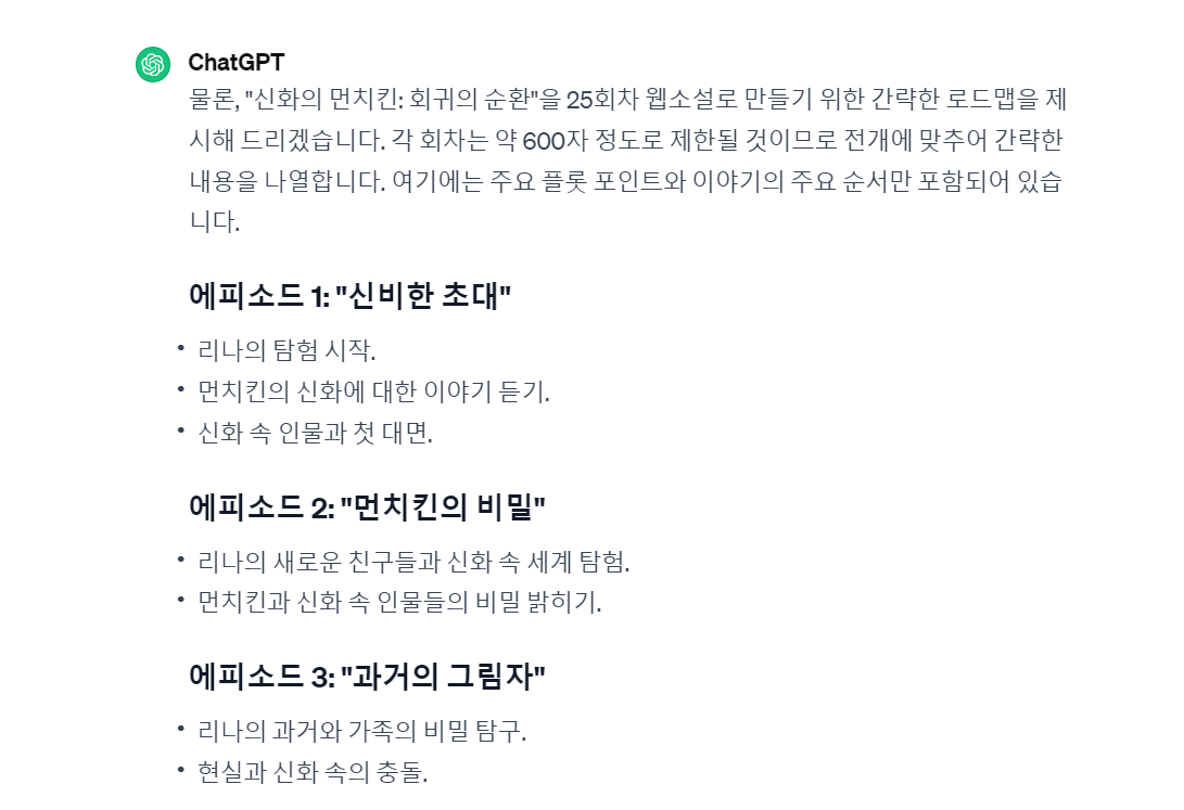 예전에는 시놉시스와 회차별로 에피소드를 뽑아내느라 엄청나게 많은 분들이 글을 쓰시기도 전에 많은 시간과 고생을 하셨는데, 생각 이상의 결과를 보여주고 있습니다. 그럼 이제 이를 토대로 초안을 만들겠습니다.