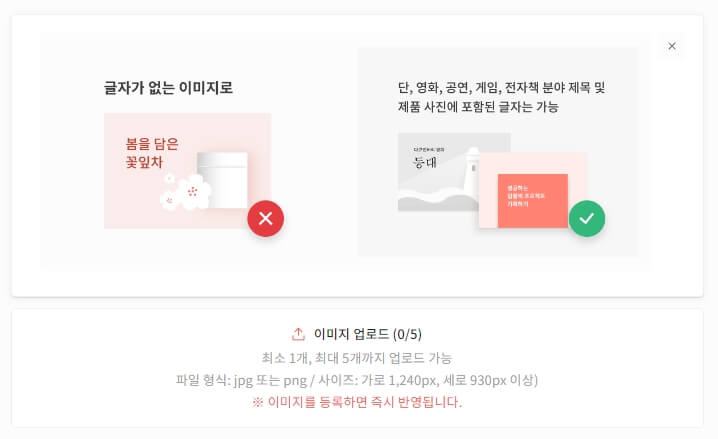 후원자 분들이 프로젝트 내용을 쉽게 파악하고 클릭하고 싶게 이미지를 만들어야 하며, 총 5개까지 이미지를 업로드해서 슬라이드 형태로 구현되며, 제일 처음 등록된 이미지가 가장 맨 처음 노출되는 대표이미지라고 생각하시면 됩니다. 이미지 업로드 시 준수사항과 업로드 사이 지는 아래 이미지와 같습니다.