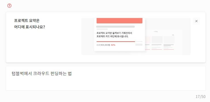 와디즈에서 서포터라는 단어를 썼다면, 텀블벅은 우리를 믿고 펀딩을 해주시는 분들을 후원자님들이라고 지칭합니다. 따라서, 후원자 분들이 프로젝트를 빠르게 이해할 수 있도록 명확하고 간략한 소개로 작성해 주시면 되고, 노출되는 위치와, 글자 수는 아래 이미지와 같습니다.