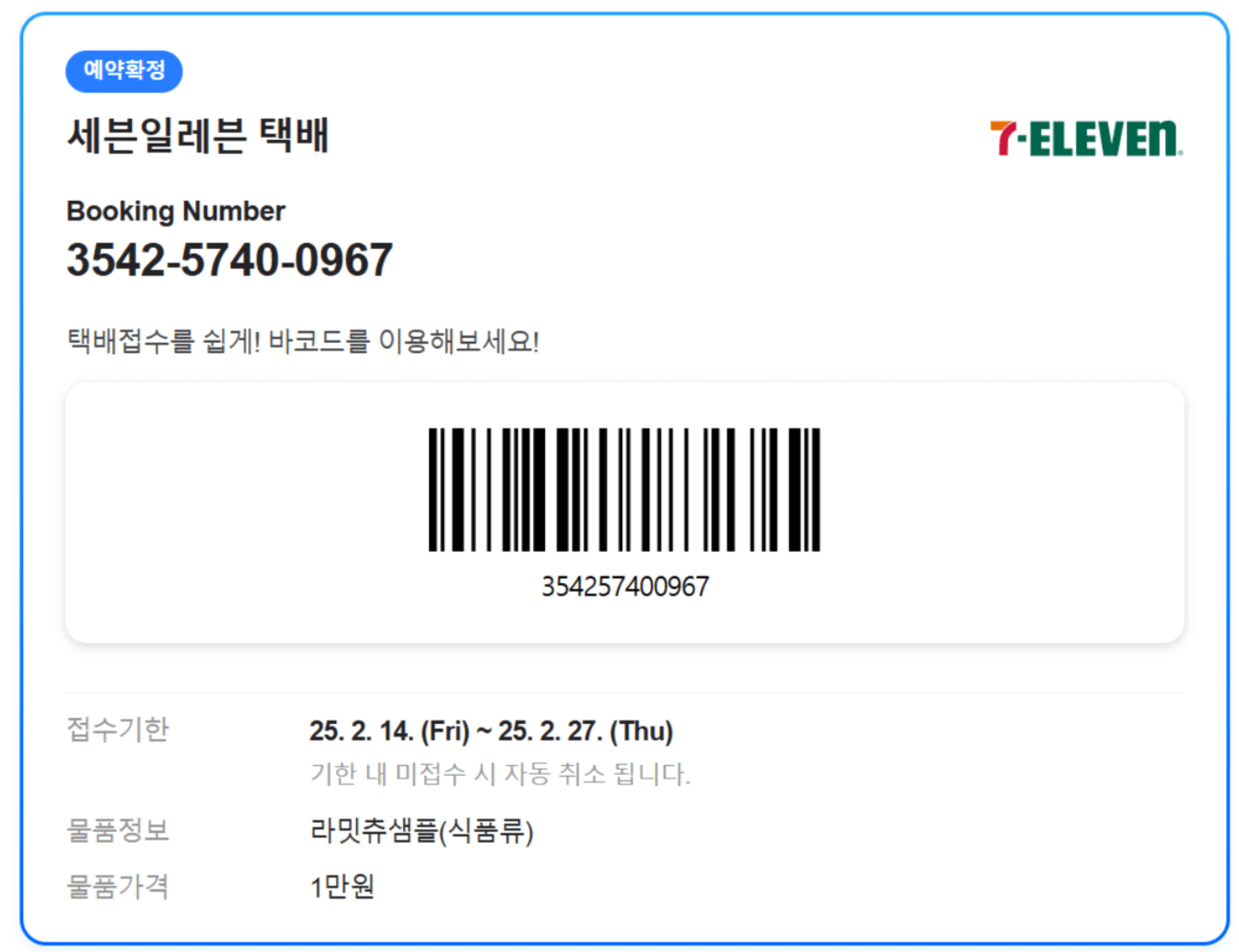 결제까지 전부 완료가 되면 드디어, 예약 확정 메시지 오아 함께 바코드를 받을 수 있습니다. 이 화면을 캡처해 놓으시면 택배 예약은 끝입니다.