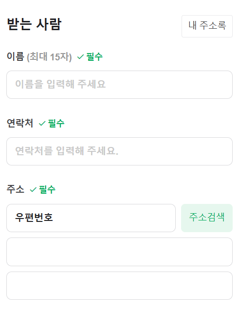 그리고, 받으시는 분의 수취 주소를 정확하게 기재합니다. 연락처 정보는 핸드폰 번호를 기재하는 것이 가장 좋습니다.