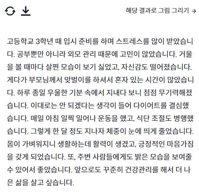 위와 같은 결과를 복사한 뒤, 여러 가지 경우의 질문들을 번갈아 작성하며 최대한 결과 값을 모은 뒤 이 내용들을 토대로 취업용 자기소개서 초안을 작성하시면 조금 더 도움은 될 것이라고 생각합니다.