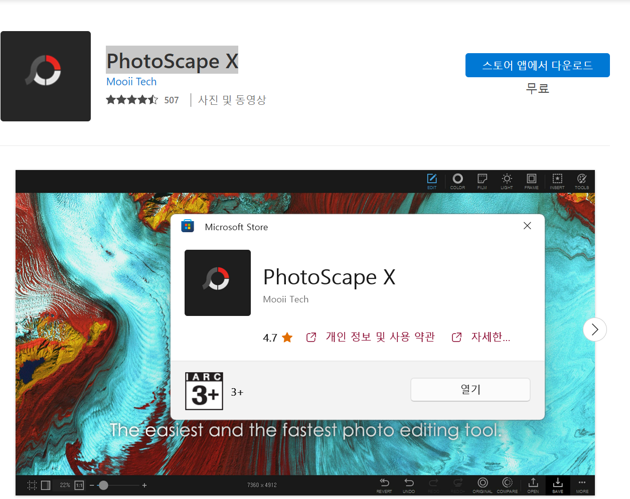 우선 간단합니다, 구글 CHROME 에서 PhotoScape X라고 검색하시면, 마이크로 소프트 스토어가 뜨고 이곳에서 다운로드 후 설치만 하시면 됩니다.